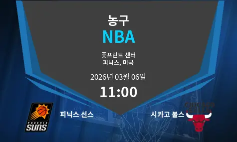 피닉스 선스와 시카고 불스 간의 매치업은 Mortgage Matchup Center에서 2026년 3월 6일 11:00에 열립니다. 양 팀은 각자 고유의 스타일로 경기를 치를 준비가 되어 있으며, 팬들에게 흥미로운 경기를 선사할 것입니다.