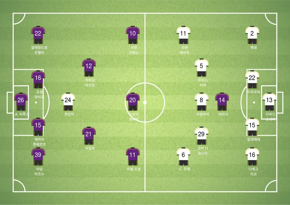 - 루이스 미야: 노련한 패스와 포지셔닝으로 중원을 안정시킵니다.