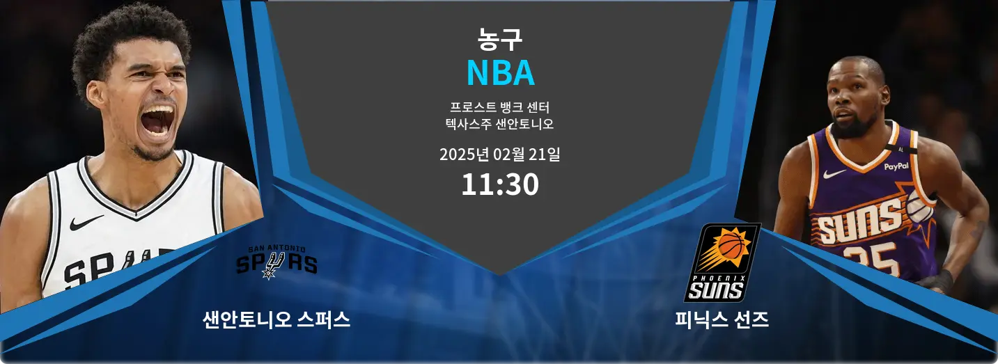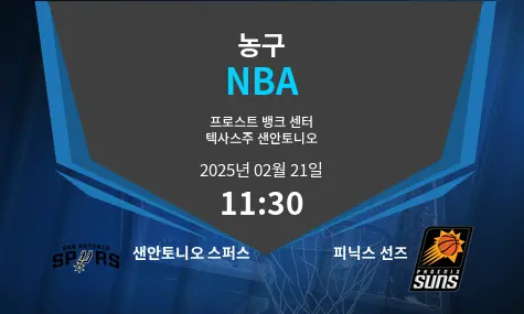 샌안토니오 스퍼스가 피닉스 선즈를 홈구장인 프로스트 뱅크 센터(텍사스 샌안토니오)에서 맞이합니다. 이 경기는 2025년 2월 21일 오전 11시 30분(KST)에 열립니다.