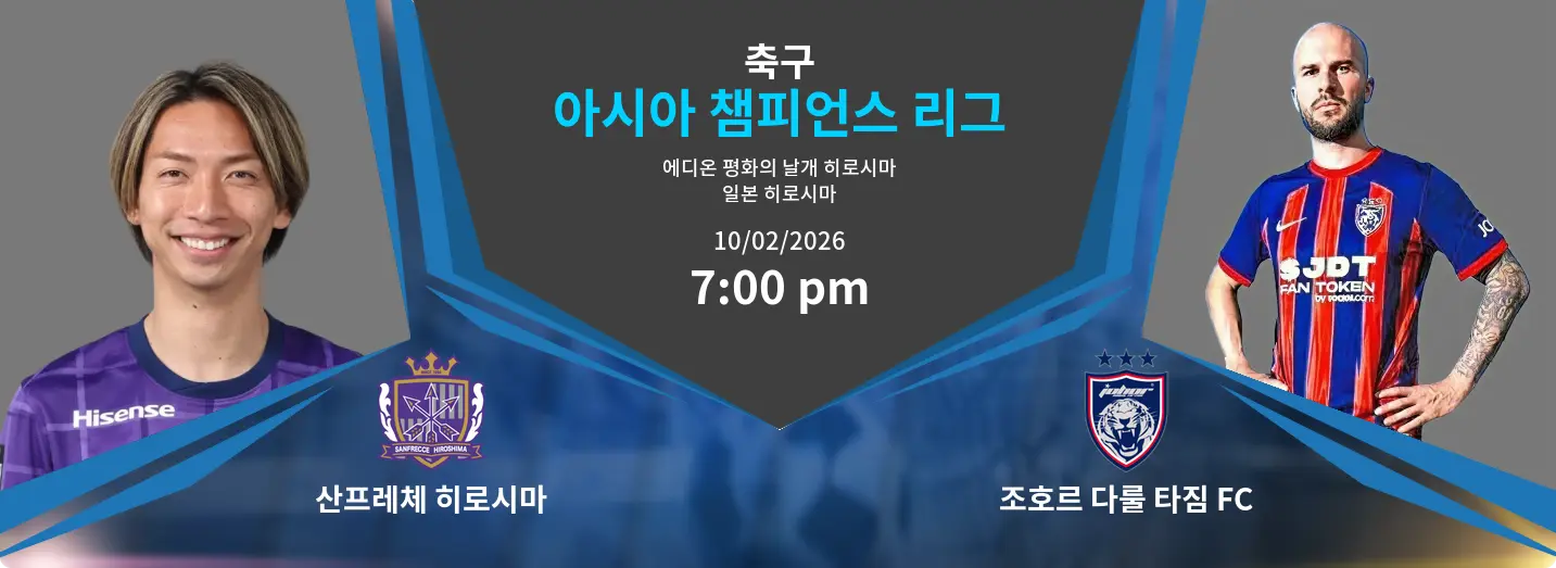 산프레체 히로시마와 조호르 다룰 타짐 FC의 매치가 에디온 피스윙 히로시마에서 2026년 2월 10일 19:00에 열립니다. 이 경기는 양 팀의 실력을 가늠할 수 있는 중요한 대결이 될 것입니다.