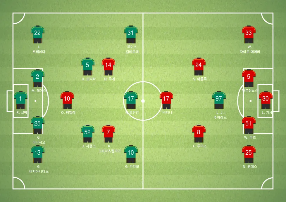 - 루이 실바는 미드필드에서 뛰어난 패스와 경기 조율 능력을 보여주고 있습니다.