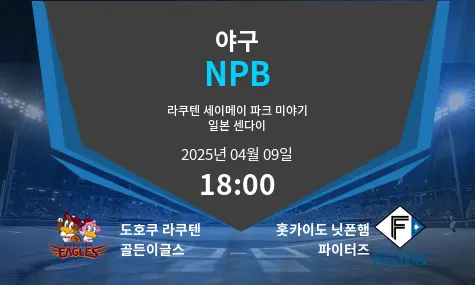 4월 9일 오후 6시(KST), 일본 센다이의 라쿠텐 세이메이 파크 미야기에서 라쿠텐 골든 이글스와 홋카이도 니혼햄 파이터스의 맞대결이 펼쳐집니다. 퍼시픽 리그의 이 경기는 시즌 초반 기세를 잡기 위한 중요한 경기로, 강한 타격력을 지닌 라쿠텐은 홈에서의 우위를 노리며, 균형 잡힌 전력을 갖춘 니혼햄은 최근 좋은 흐름을 이어가려 합니다.