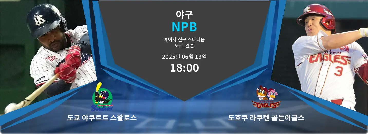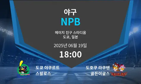 2025년 6월 19일, 일본 도쿄의 메이지 진구 스타디움에서 도쿄 야쿠르트 스왈로스가 도호쿠 라쿠텐 골든이글스를 홈으로 맞이합니다. 이번 경기는 다득점 양상을 보일 가능성이 높은 매치업입니다. 야쿠르트는 현재 센트럴 리그 하위권에 머물고 있으며, 라쿠텐은 최근 한신 타이거스를 상대로 스윕 승리를 거두며 상승세를 타고 있습니다.