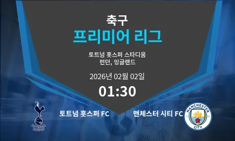 2026년 2월 2일 01:30에 토트넘 홋스퍼 스타디움에서 토트넘 홋스퍼 FC와 맨체스터 시티 FC의 치열한 축구 경기가 펼쳐질 예정입니다. 두 팀 모두 프리미어리그에서 경쟁력 있는 팀으로 손꼽히며, 이번 매치업은 양 팀 모두에게 중요한 의미를 가집니다. 이 경기는 축구 팬들에게 흥미진진한 순간들을 제공할 것입니다.