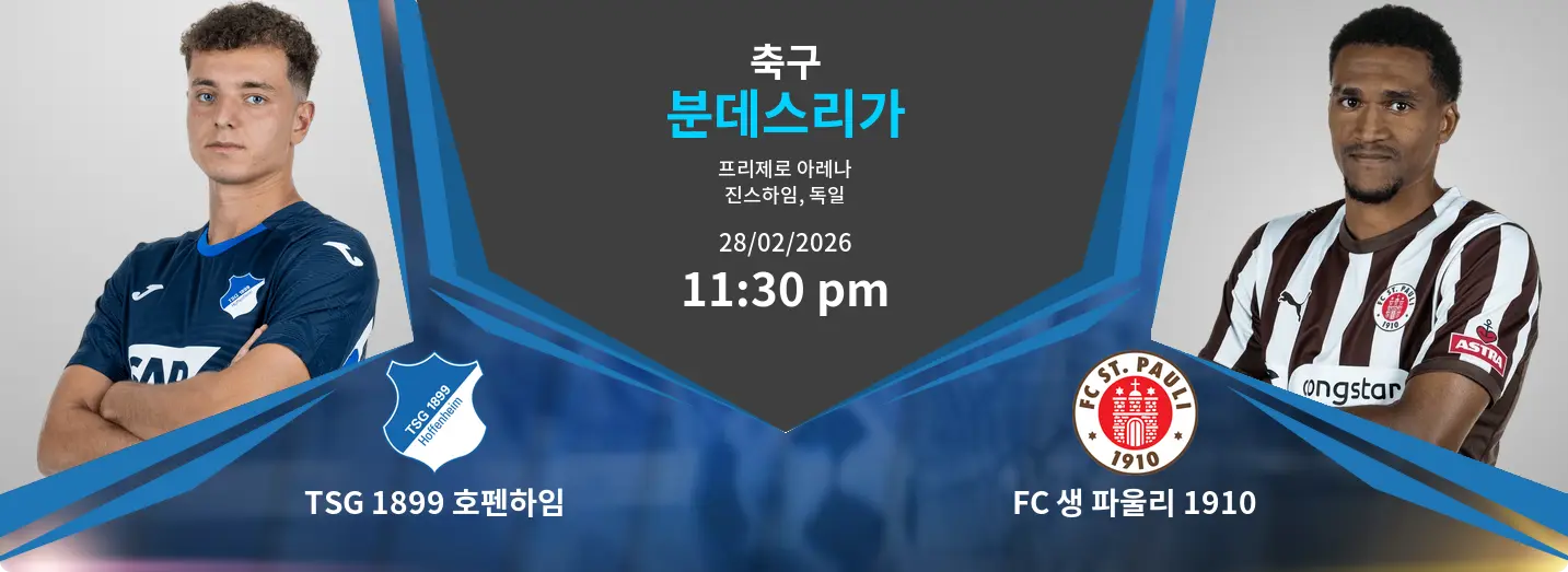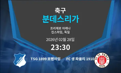 TSG 1899 호펜하임과 FC 생 파울리 1910의 경기는 2026년 2월 28일에 PreZero Arena에서 개최됩니다. 경기는 23:30에 시작될 예정입니다.