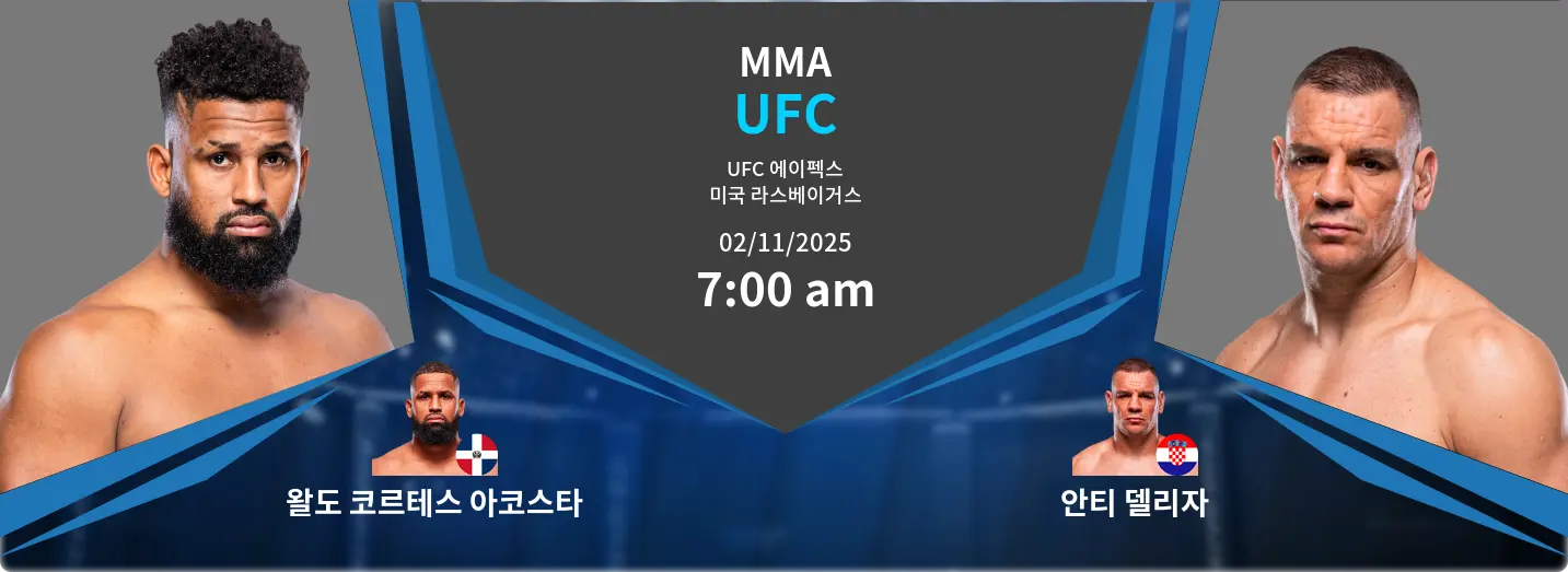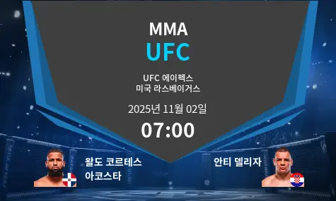 랭킹 6위의 왈도 “살사 보이” 코르테스-아코스타와 랭킹 9위의 안테 “워킹 트러블” 델리야 간의 매우 기대되는 헤비급 경기가 2025년 11월 2일, 미국 라스베이거스의 UFC APEX에서 열릴 예정입니다. 두 선수 모두 최근 인상적인 경기를 펼쳤으며, 디비전 순위를 올리려 하고 있습니다. 코르테스-아코스타는 강력한 수비를 갖춘 다량의 스트라이커이며, 델리야는 승리의 절반을 녹아웃으로 장식한 강력한 피니셔입니다. 이 경기는 코르테스-아코스타의 내구성과 경기량 대 델리야의 뛰어난 마무리 능력과 녹아웃 위협이 맞붙는 구도입니다.