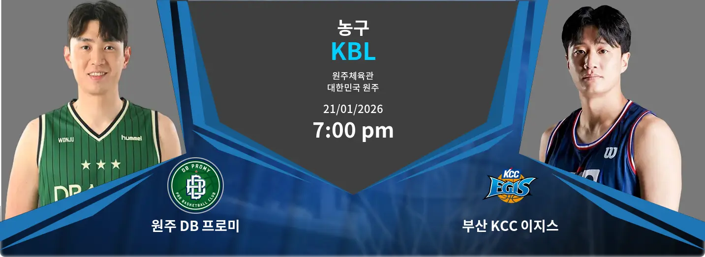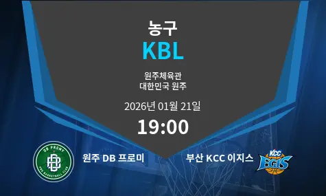 원주 DB 프로미와 부산 KCC 이지스의 대결이 2026년 1월 21일 19:00에 원주체육관에서 열립니다. 두 팀 모두 이번 시즌 강력한 모습을 보여주고 있어 치열한 경기가 예상됩니다.