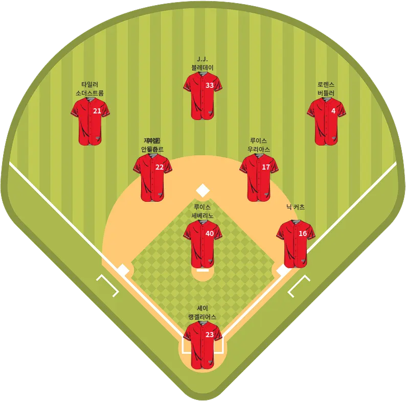 - J.J. 블레데이 (중견수): 장타력 있는 타자이나 안정성은 떨어짐.